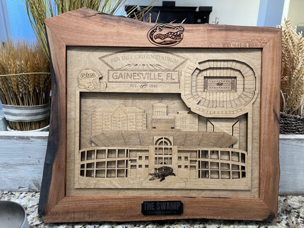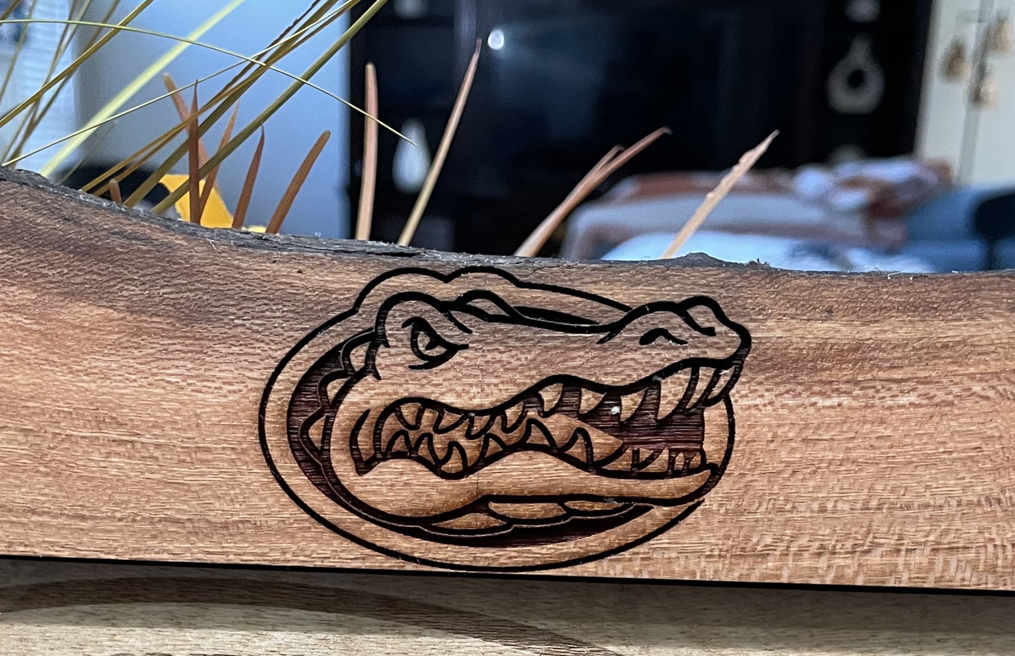 stadium. Custom Gator head engraved in the live edge and a custom plaque logo.