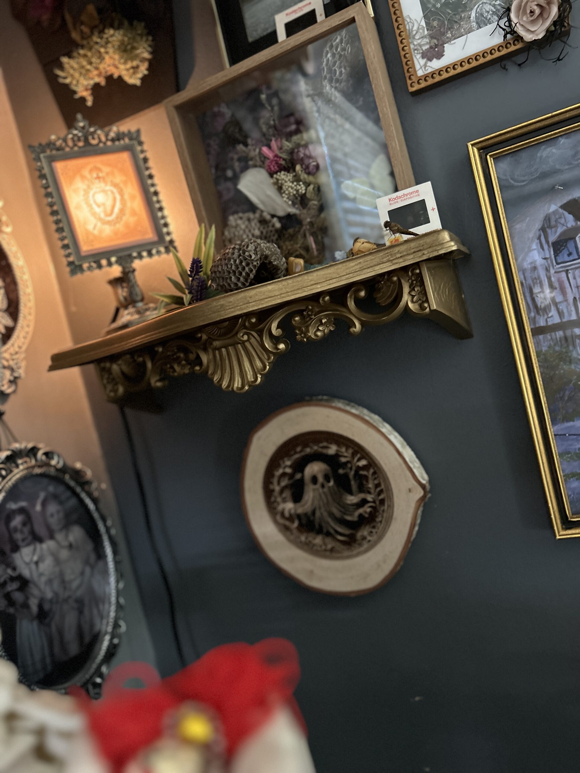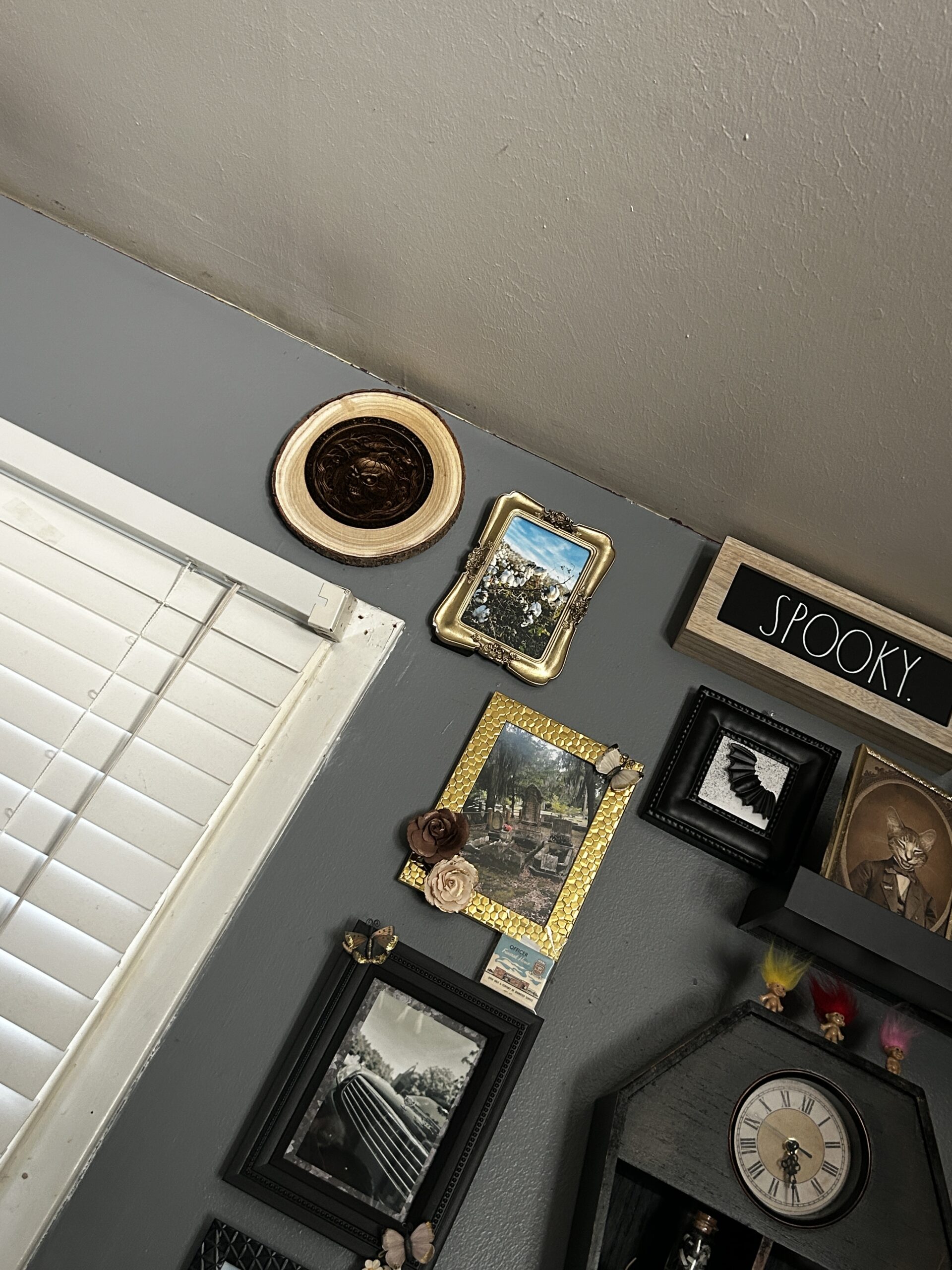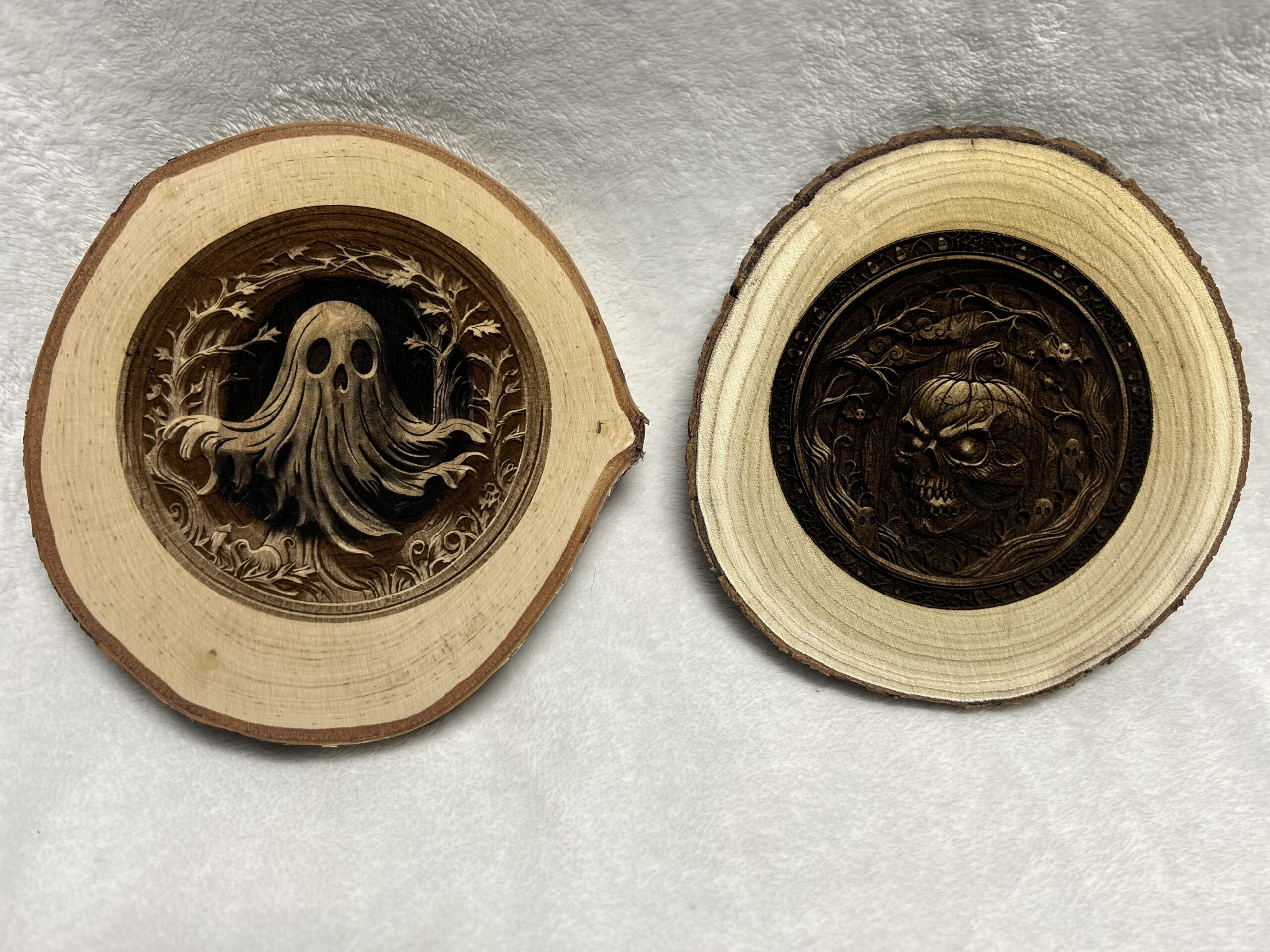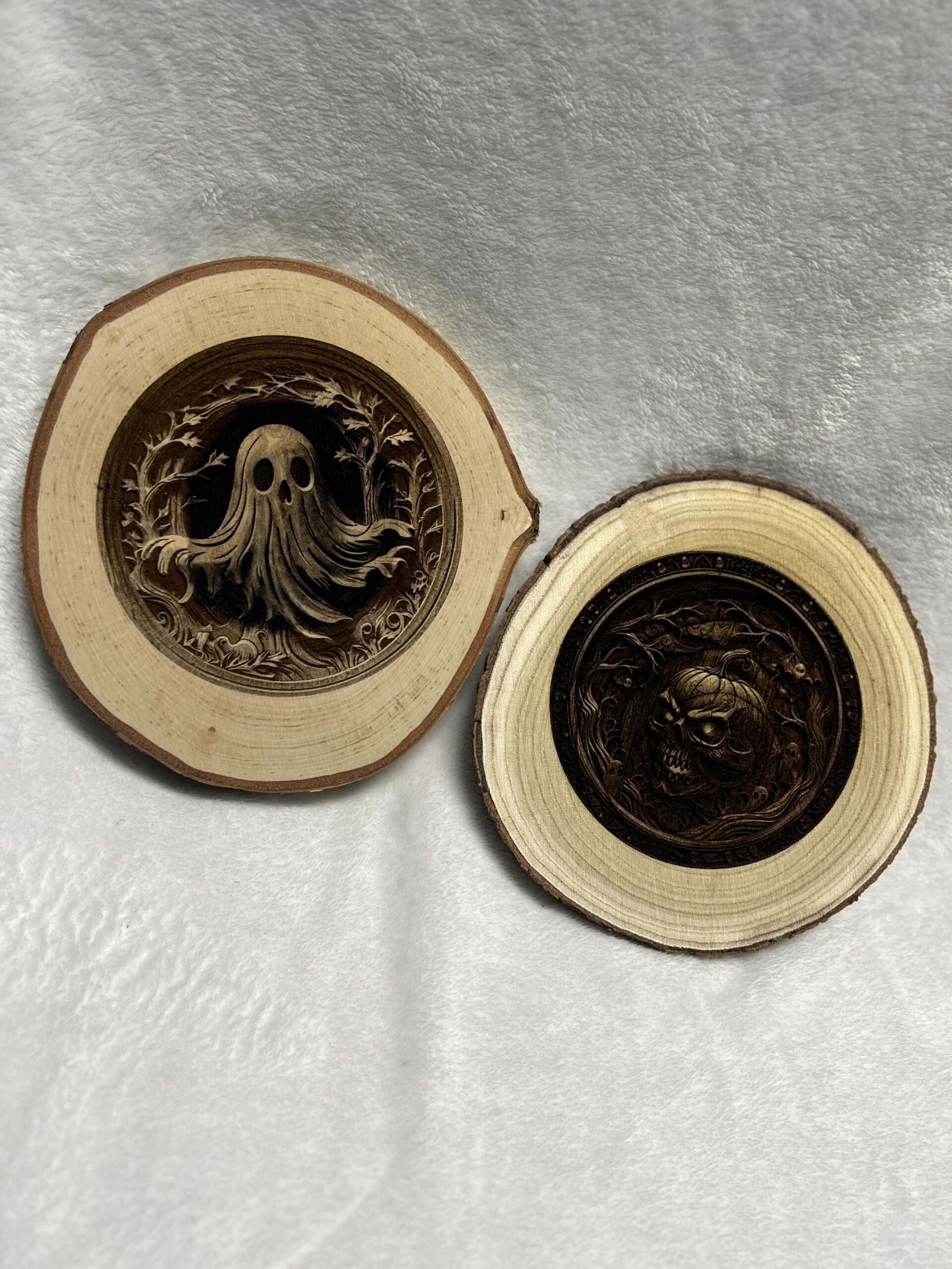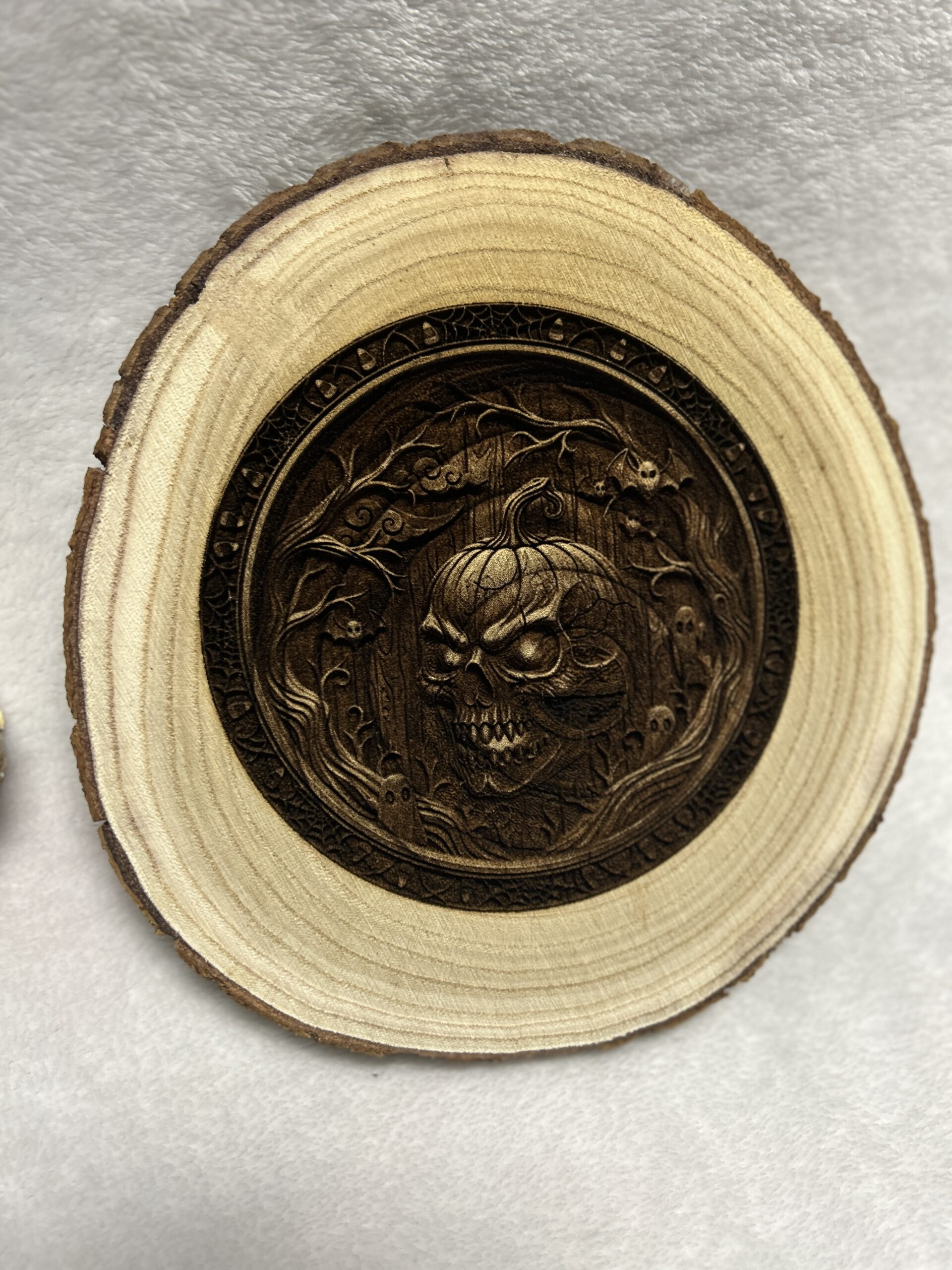 Contrasting the raw, organic beauty of the bark-edged wood round with a dark, intricate engraving, this piece strikes the perfect balance between rustic farmhouse charm and spooky gothic elegance. It stands perfectly on a shelf, desk, or mantle, bringing a touch of the supernatural to your everyday space.