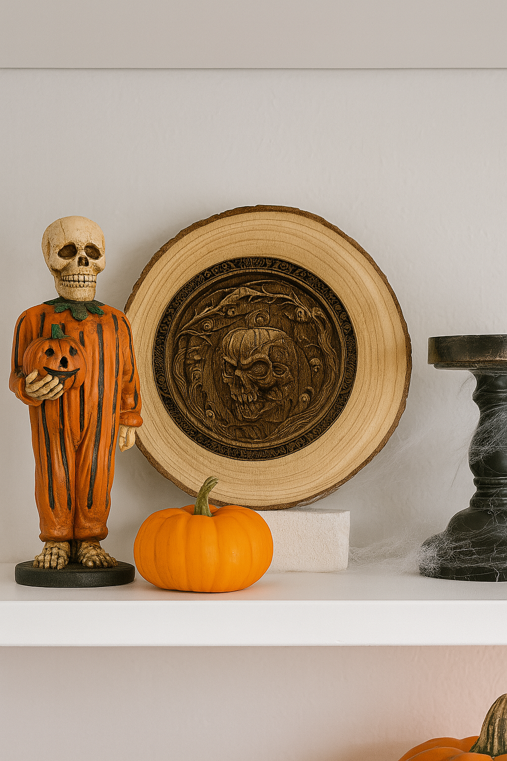 Elevate your seasonal decor with the warmth of natural wood and the precision of modern art. This exquisite display piece features a high-definition 3D relief carving that captures every crack in the skull and every twist of the vine.